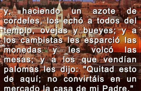 Se acercaba la Pascua de los judíos y Jesús subió a Jerusalén. Y encontró en el templo a los vendedores de bueyes, ovejas y palomas, y a los cambistas sentados; y, haciendo un azote de cordeles, los echó a todos del templo, ovejas y bueyes; y a los cambistas les esparció las monedas y les volcó las mesas; y a los que vendían palomas les dijo: