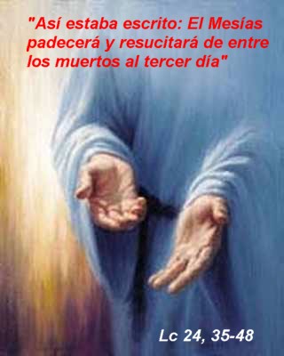 —«Así estaba escrito: el Mesías padecerá, resucitará de entre los muertos al tercer día, y en su nombre se predicará la conversión y el perdón de los pecados a todos los pueblos, comenzando por Jerusalén. Vosotros sois testigos de esto.»