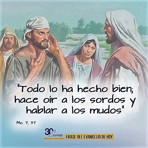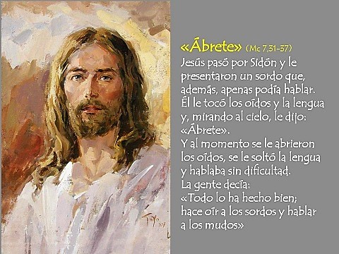 En el relato del evangelio de este domingo te vemos, Jesús, poniendo tus manos sobre un sordomudo y haciendo posible que sus oídos oyeran y su lengua hablara. Este hecho hizo que muchos entonaran un himno de alabanza agradecida y que dijeran de ti lo que no se ha dicho de nadie: «Todo lo ha hecho bien: hace oír a los sordos y hablar a los mudos». Gracias, Señor, por tu cercanía a esa persona. Ayúdanos a nosotros a que nuestros oídos estén siempre dispuestos a escucharte y a que nuestra lengua proclame tu Buena Noticia.