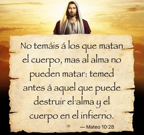 No tengáis miedo a los que matan el cuerpo, pero no pueden matar el alma. No; temed al que puede llevar a la perdición alma y cuerpo en la gehenna. ¿No se venden un par de gorriones por un céntimo? Y, sin embargo, ni uno solo cae al suelo sin que lo disponga vuestro Padre. Pues vosotros hasta los cabellos de la cabeza tenéis contados. Por eso, no tengáis miedo: valéis más vosotros que muchos gorriones.
