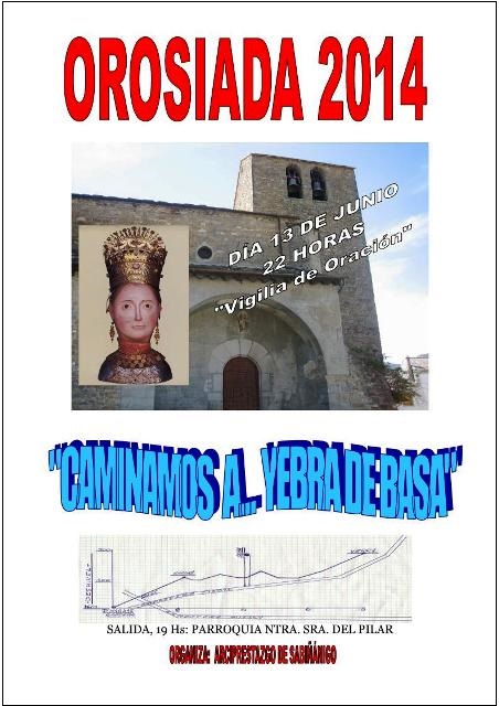 La Orosiada, la marcha peregrinante que venimos haciendo desde hace ya unos años, será el día 13 de Junio, viernes. Comenzará a las 7 de la tarde en la Parroquia del Pilar de Puente Sardas y terminará en Yebra de Basa, a las 22 horas, con un encuentro de oración ante la reliquia de Santa Orosia. Todos estamos invitados. De una forma especial, los jóvenes. Con más razón, si cabe, aquellos que han estado preparándose para la confirmación o que acaban de ser confirmados. Como siempre, habrá autobús para la vuelta. ¡Os esperamos! Más información en el último post de esta página.