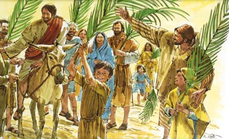 Fueron los discípulos e hicieron lo que les había mandado Jesús: trajeron la borrica y el pollino, echaron encima sus mantos y Jesús se montó. La multitud extendió sus mantos por el camino; algunos cortaban ramas de árboles y alfombraban la calzada.