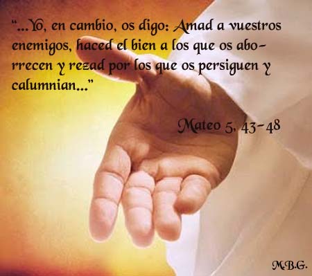 Amad a vuestros enemigos, haced el bien a los que os aborrecen y rezad por los que os persiguen y calumnian. Así seréis hijos de vuestro Padre que está en el cielo, que hace salir su sol sobre malos y buenos y manda la lluvia a justos e injustos.