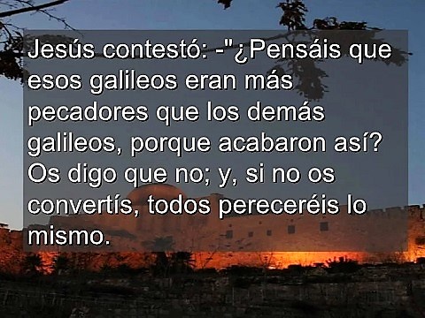 « ¿Pensáis que esos galileos eran más pecadores que los demás galileos porque han padecido todo esto? Os digo que no; y, si no os convertís, todos pereceréis lo mismo. O aquellos dieciocho sobre los que cayó la torre en Siloé y los mató, ¿pensáis que eran más culpables que los demás habitantes de Jerusalén? Os digo que no; y, si no os convertís, todos pereceréis de la misma manera».